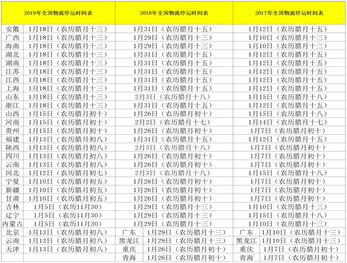 物流放假停运是每年都会有的事情,并不仅仅是今年。对历年来的物流停运时间小编也做了相关整理,具体如下: